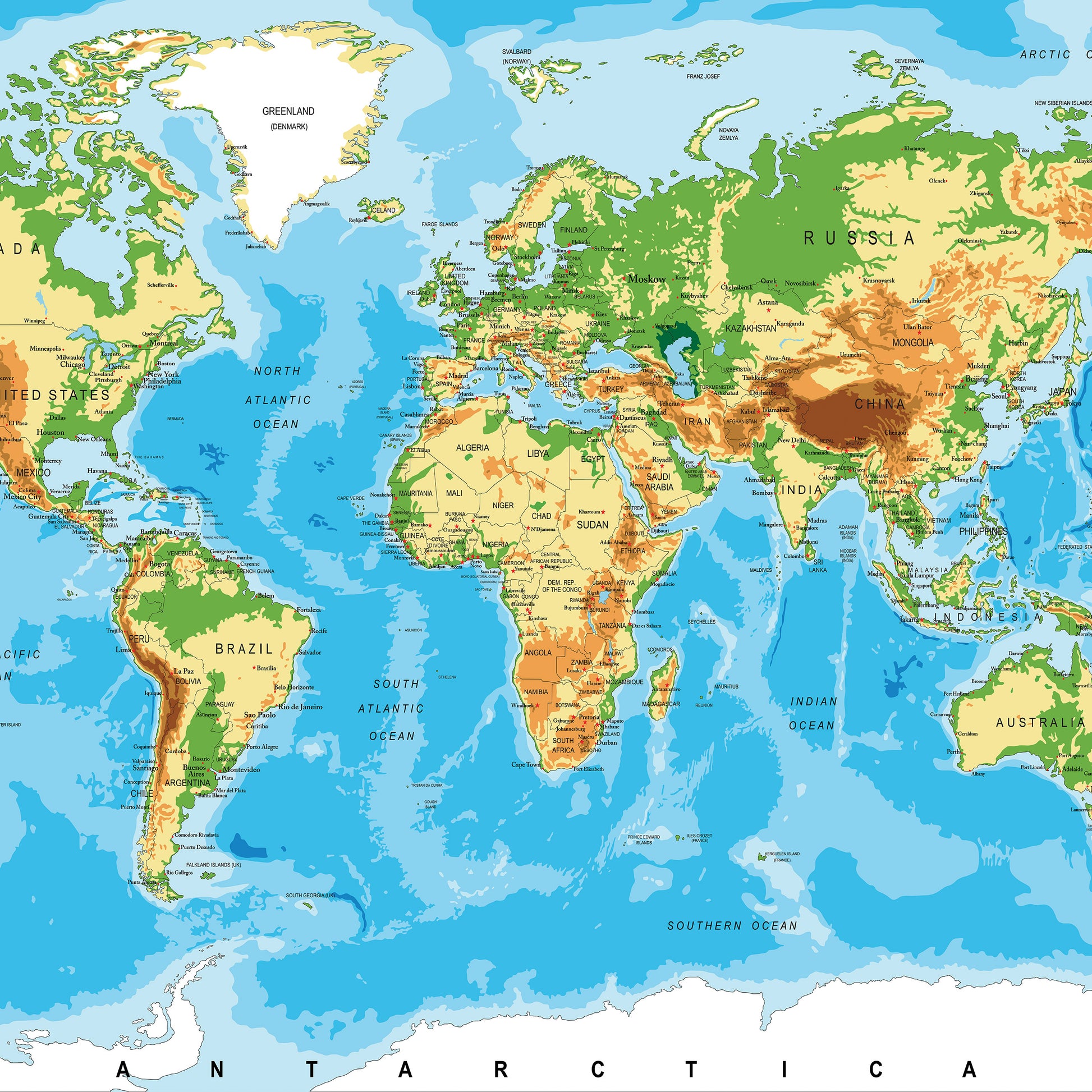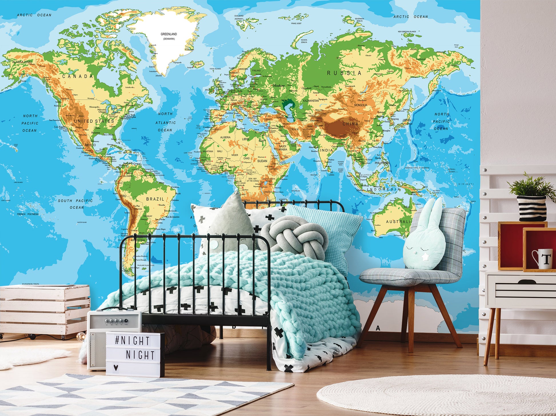 Physical Map of the World Blue School Decor Non-woven Photo Wallpaper (W x H) 312 cm x 219 cm (123" x 86")