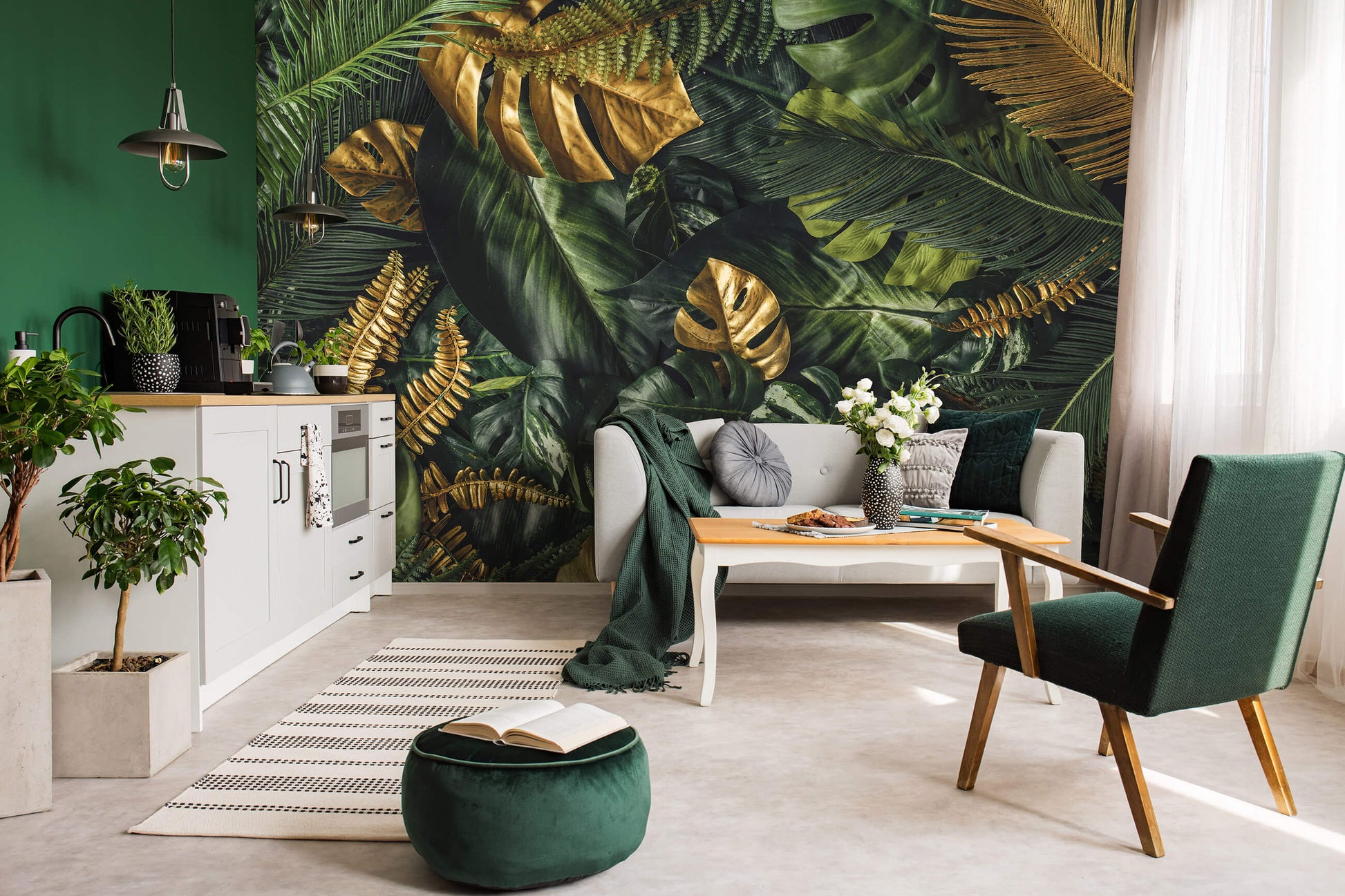 Green and Gold Jungle Botanical Non-woven Photo Wallpaper (W x H) 312 cm x 219 cm (123" x 86")